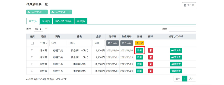「複写して請求書を発行」をクリックし、別の請求書を作成することもできます。