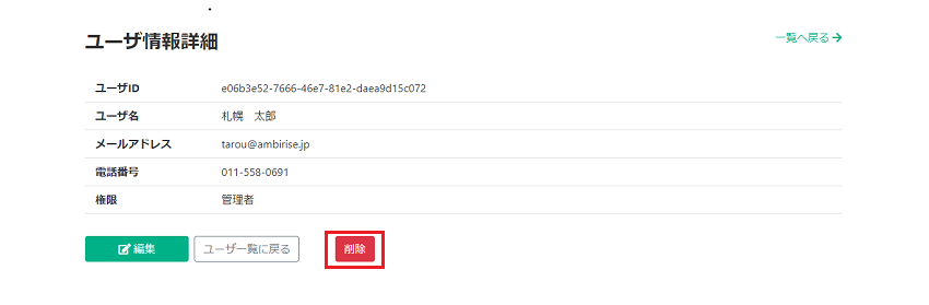 ユーザーの削除をしたい場合は、同様に「詳細」をクリックした後の画面で「削除」をクリックします。